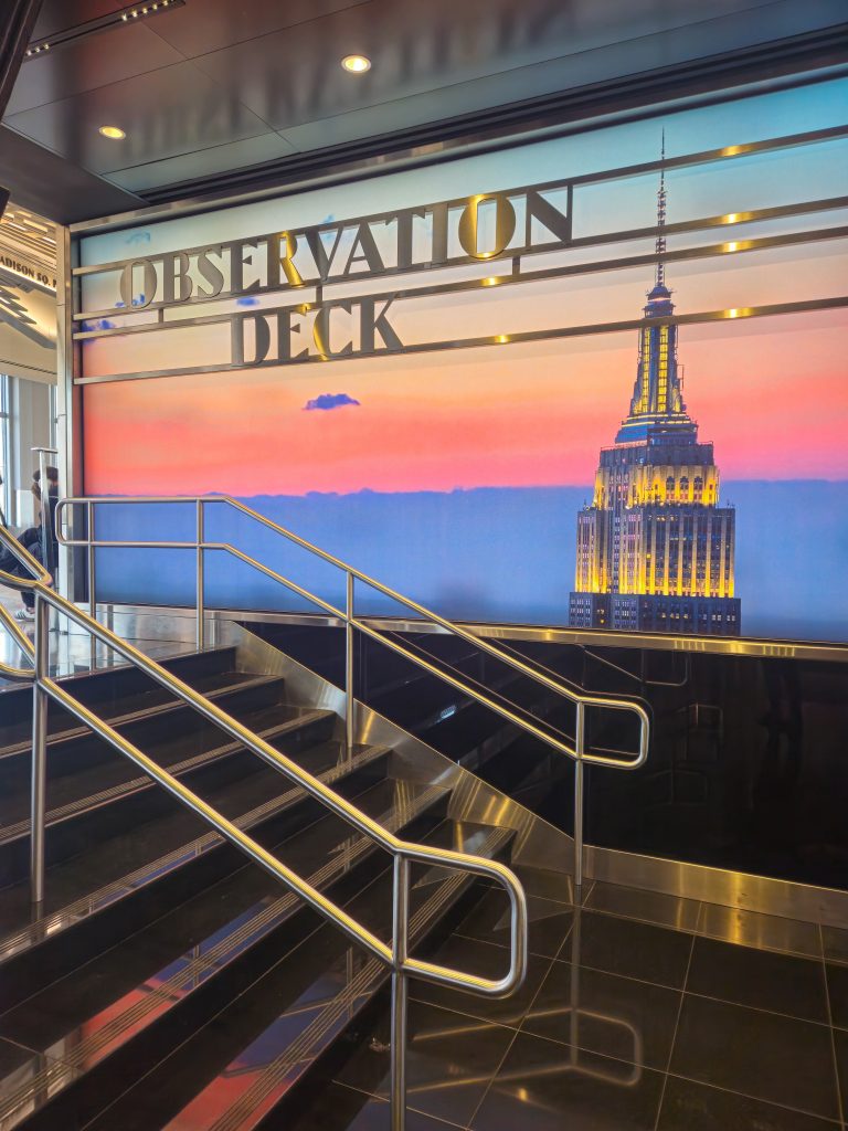 Wir konnten entspannt durchlaufen und waren zügig und passend mit unserem Zeitfenster auf dem Weg zur Besucherterrasse, dem Observation Deck.