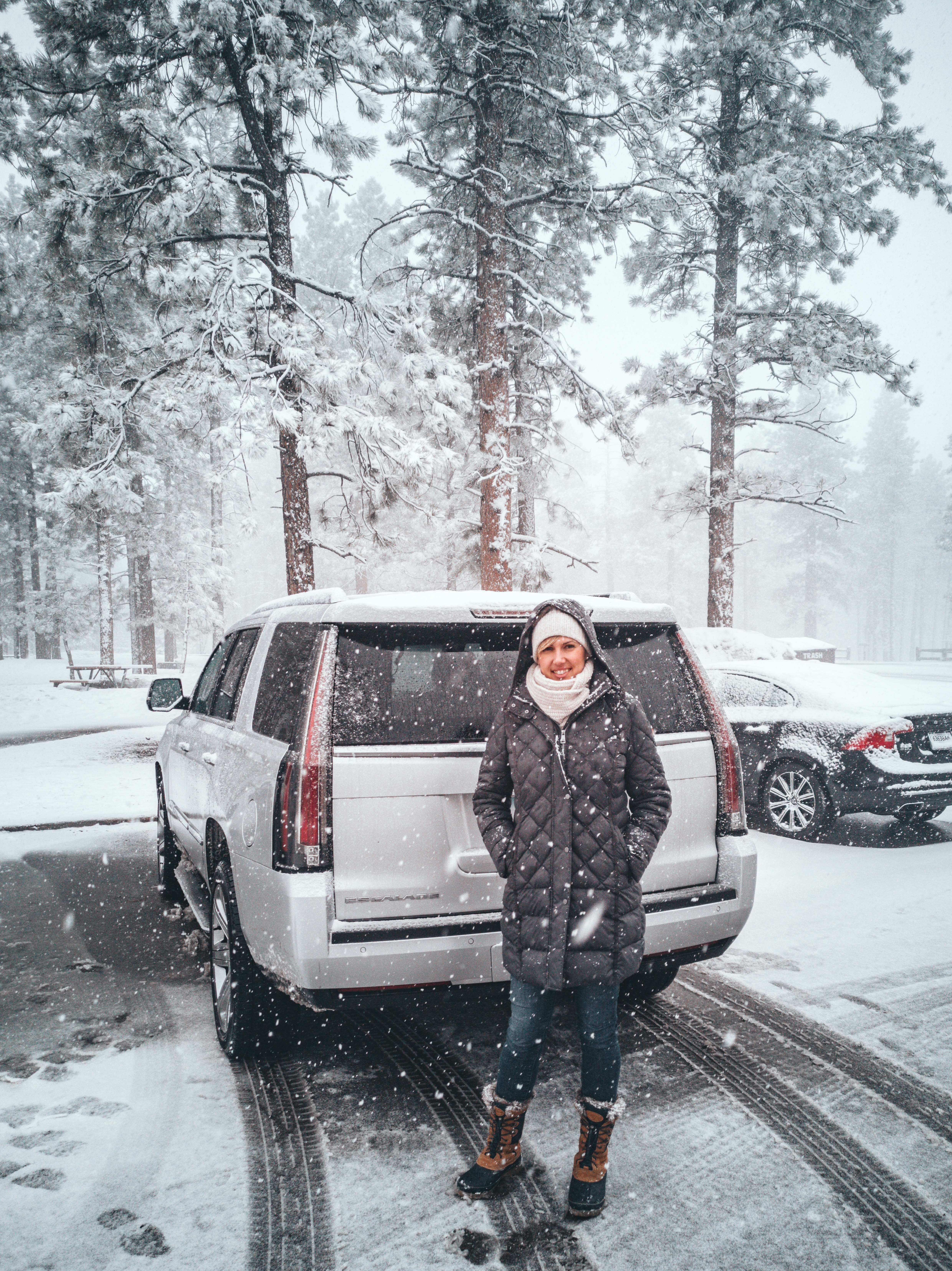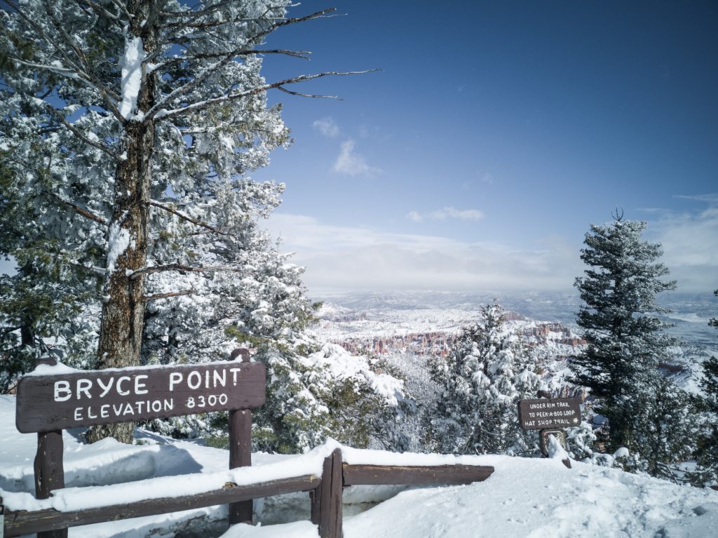 Auch der Bryce Canyon National Park ist genau für diese Aussicht weltberühmt, wenn auch nicht unbedingt im Wintergewand. Für mich war es nun schon der zweite Winterbesuch hier. In einem früheren Las Vegas Layover bin ich zum National Park gefahren und konnte diese Aussicht noch kurz schneefrei bewundern, denn schon am nächsten Morgen lag so viel Schnee, dass man nicht auf den Grund des Canyons sehen konnte und nicht alle Straßen befahrbar waren. Witzigerweise war es auch bei diesem Besuch in Begleitung meines Mannes so. Die Wettervorhersage war auf den Punkt, und bei unserer Ankunft am Nachmittag fing es doch tatsächlich an zu schneien. Noch am selben Abend stiefelten wir durch das Schneegestöber zum Restaurant, um dann aber am nächsten Morgen mit einem blauen Himmel und Unmengen Schnee vor der Tür aufzuwachen. Wir konnten es gar nicht abwarten zu den Aussichtspunkten zu fahren und diese Winterlandschaft nun gemeinsam zu genießen. Zwar waren auch dieses Mal aufgrund der Schneemassen nicht alle Straßen im Park geräumt, aber was will man noch mehr.
