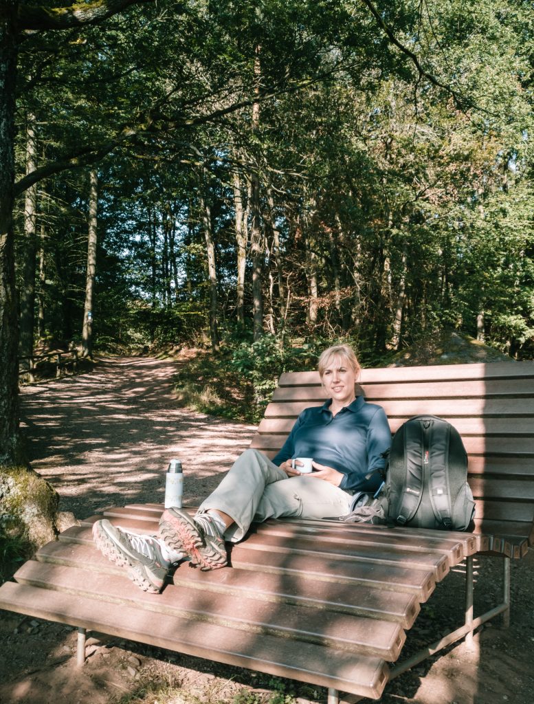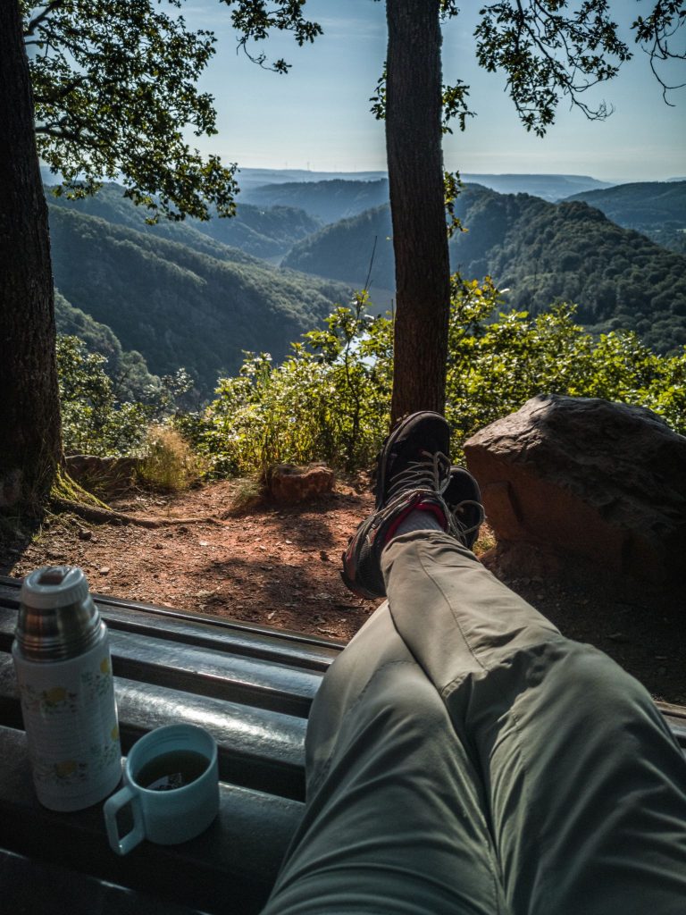 Um so nah wie möglich an den Aussichtspunkt zu kommen, habe ich auf dem Parkplatz Cloef-Atrium geparkt, der bis 8 Uhr kostenfrei ist und nur ca 5 Minuten Fußweg vom Aussichtspunkt entfernt ist. Man passiert das Besucherzentrum sowie den Eingang zum Baumwipfelpfad, hält sich rechts und läuft durch den Wald immer geradeaus auf die Saarschleife zu. Hier angekommen gibt es eine kleine befestigte Aussichtsplattform. Besucherzentrum und Baumwipfelpfad öffnen nicht vor 9.30 Uhr. Möchte man die auch noch besuchen, bietet sich eine kleine Wanderung rund um den Aussichtspunkt an. Auch längere Wanderungen hinab ins Tal sind von hier aus möglich. Ich habe mich für einen Spaziergang in der Nähe entschieden und eine Teepause mit Aussicht auf die Saar eingelegt. Ich war ja schon eine Weile unterwegs und brauchte eine Stärkung.