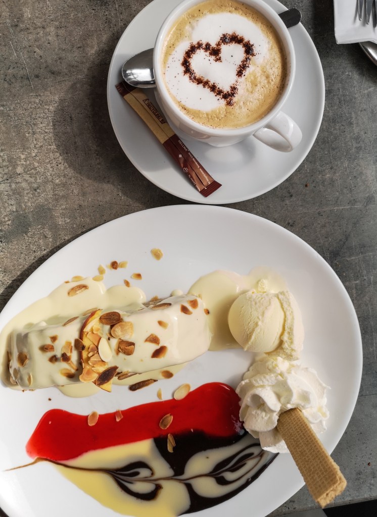Mit müden Augen und einem Bärenhunger konnte ich noch einen Platz in einem der Restaurants direkt am Wasserlauf in der historischen Altstadt ergattern. Saarburg ist nicht nur für seinen alten Stadtkern bekannt sondern auch für seinen Apfelstrudel. Nachdem ich für das frühe Aufstehen und die weite Anreise mit einem herrlichen Sonnenaufgang belohnt worden war, gab es zum Abschluss noch die Belohnung für den Leib. Apfelstrudel musste natürlich sein.