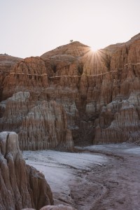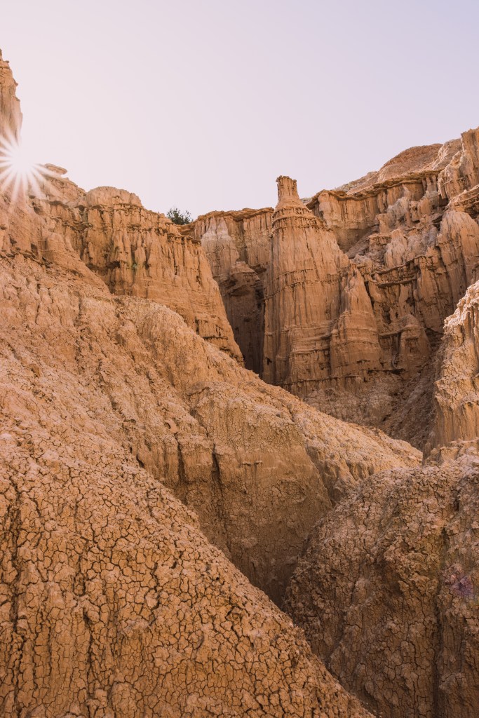 Nicht ganz pünktlich zum Sonnenaufgang, aber noch immer zeitig genug, um einen wunderbaren Sonnenstern zu fotografieren, war ich im State Park angekommen. Der Tag war noch jung, ich aber schon ganz schön happy. Ich liebe Sonnenaufgänge. Das Licht ist noch weich und wirft mitunter interessante Schatten. Für Fotografen ist das neben den Sonnenuntergängen vermutlich die schönste Tageszeit. Außerdem sind um diese Uhrzeit nur wenige Menschen unterwegs, sodass man in Ruhe fotografieren und genießen kann. Wobei genießen hier im Cathedral Gorge State Park gar nicht so unwichtig ist. Er liegt auf 1500m über dem Meer. Und schon im Mai sind die Temperaturen im Gegensatz zum tiefer gelegenen Las Vegas spürbar angenehmer.