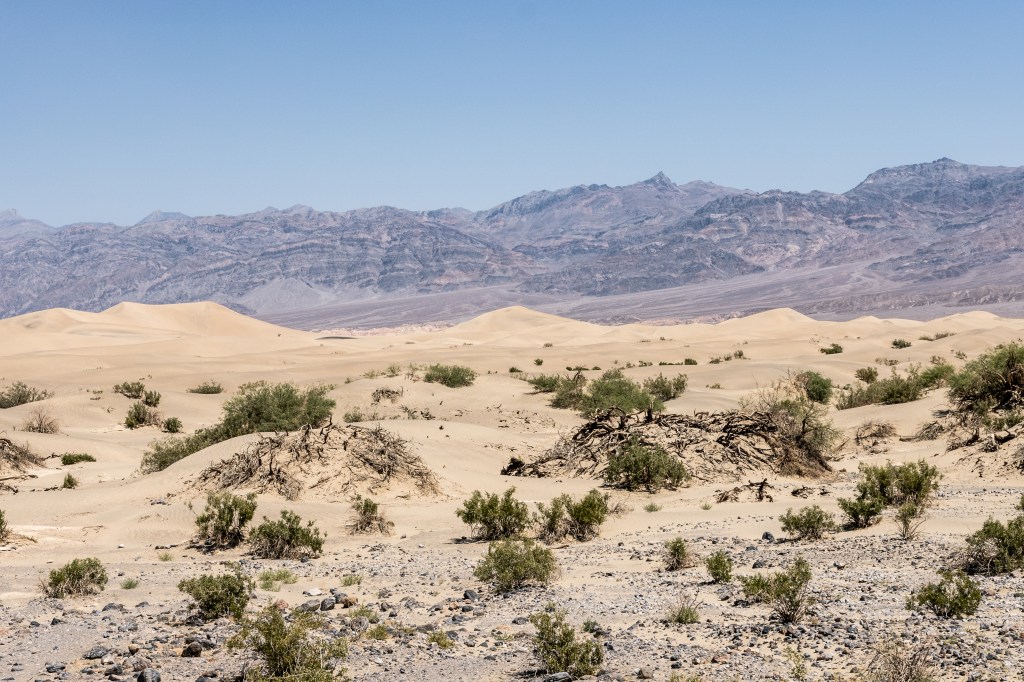 Fährt man durch den National Park, kommt man unweigerlich an den Mesquite Sand Dunes vorbei. Vor der beeindruckenden Felsenlandschaft stechen diese goldgelben Sandünen definitiv ins Auge. Es ist erlaubt, die Dünen zu erklimmen und herumzulaufen. Bei 40 Grad kurz nach Mittag war mir der Aufstieg aber zu anstrengend. Nur gucken ist ja manchmal auch ganz schön.